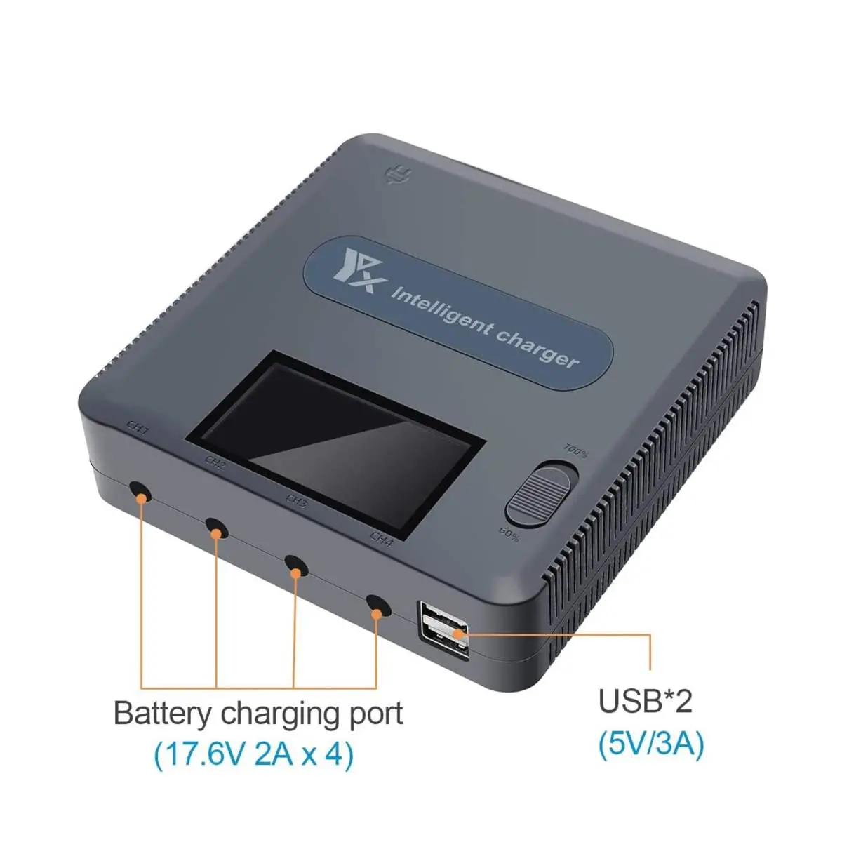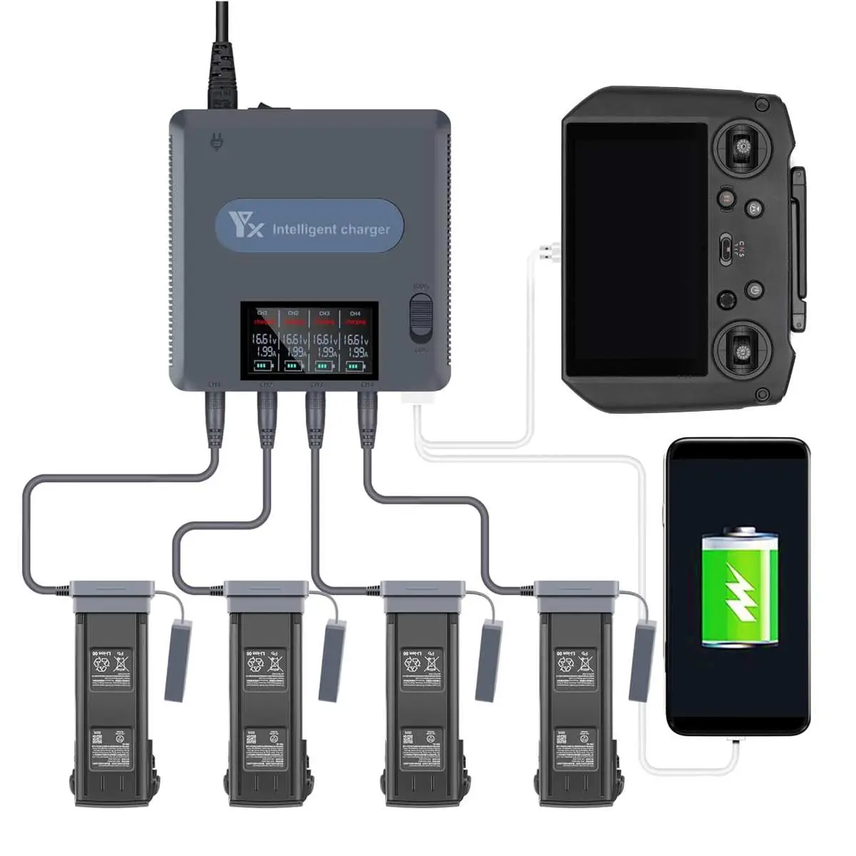 - Gleichzeitiges Laden von 4 Flug-Akkus und 2 USB Geräten