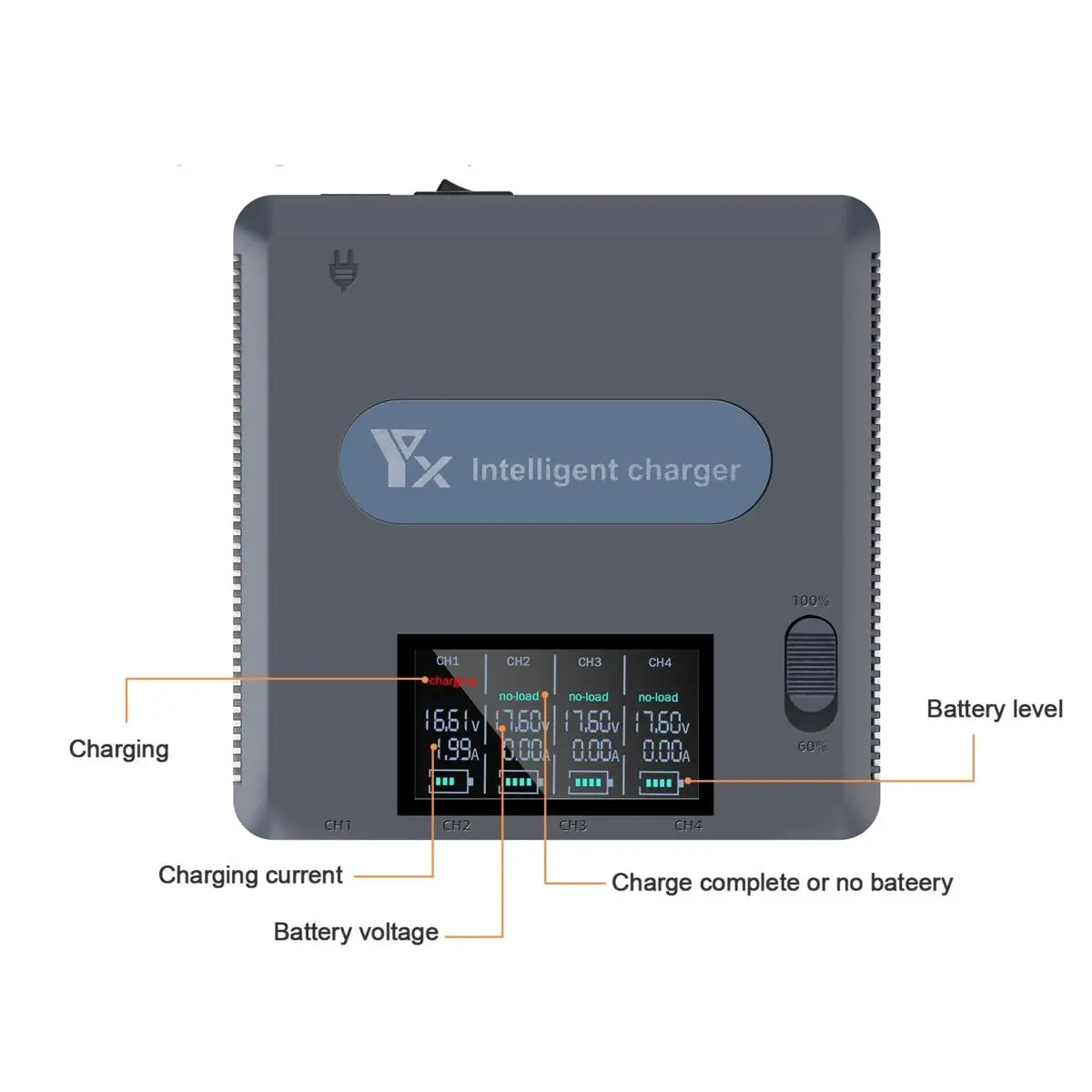 Übersichtliche Statusanzeige für alle 4 Ladeanschlüsse separat mit Ladestrom, Akkuspannung und Akkustand.