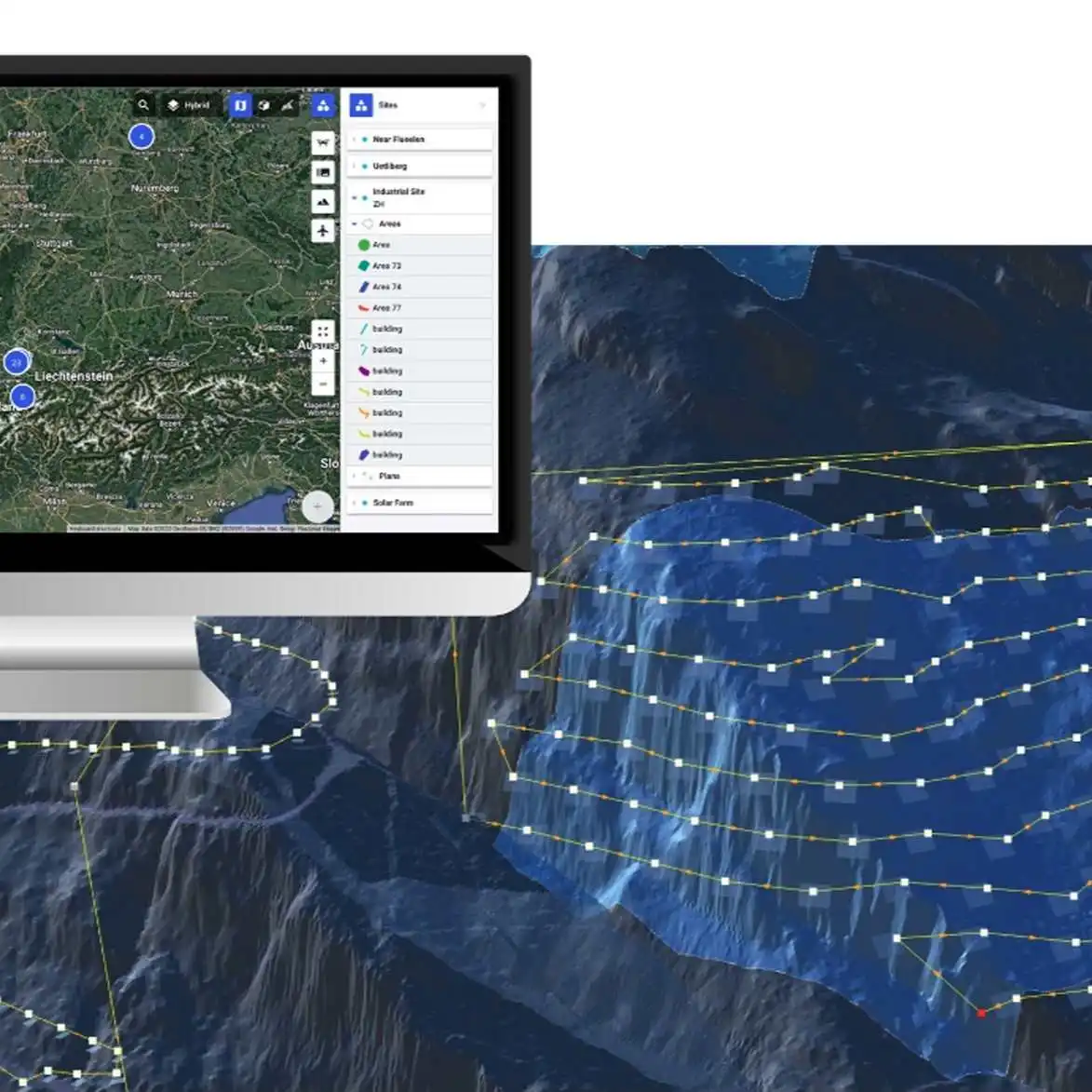 Planen Sie Gelände-Missionen basierend auf benutzerdefinierten Terrain-Daten oder nutzen Sie die Daten von hochwertigen Quellen wie zB der Airbus-API.