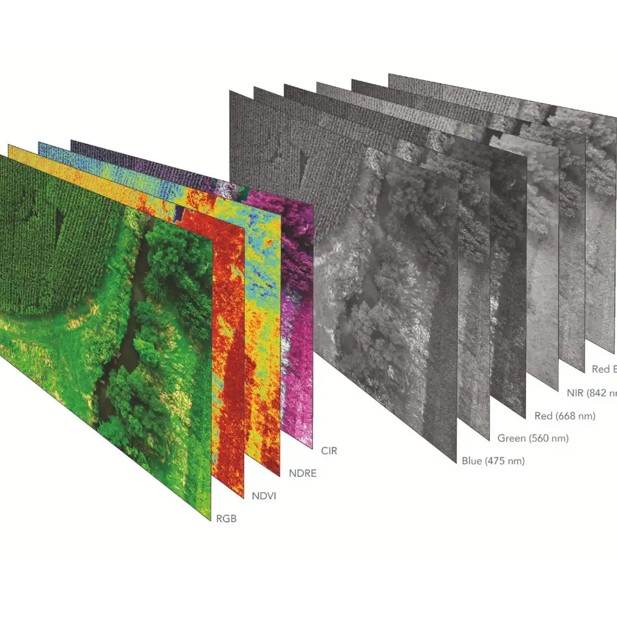 Wavelength (nm): Blue (475 nm center, 32 nm bandwidth), green (560 nm center, 27 nm bandwidth), red (668 nm center, 14 nm bandwidth), red edge (717 nm center, 12 nm bandwidth), near-IR (842 nm center, 57 nm bandwidth)